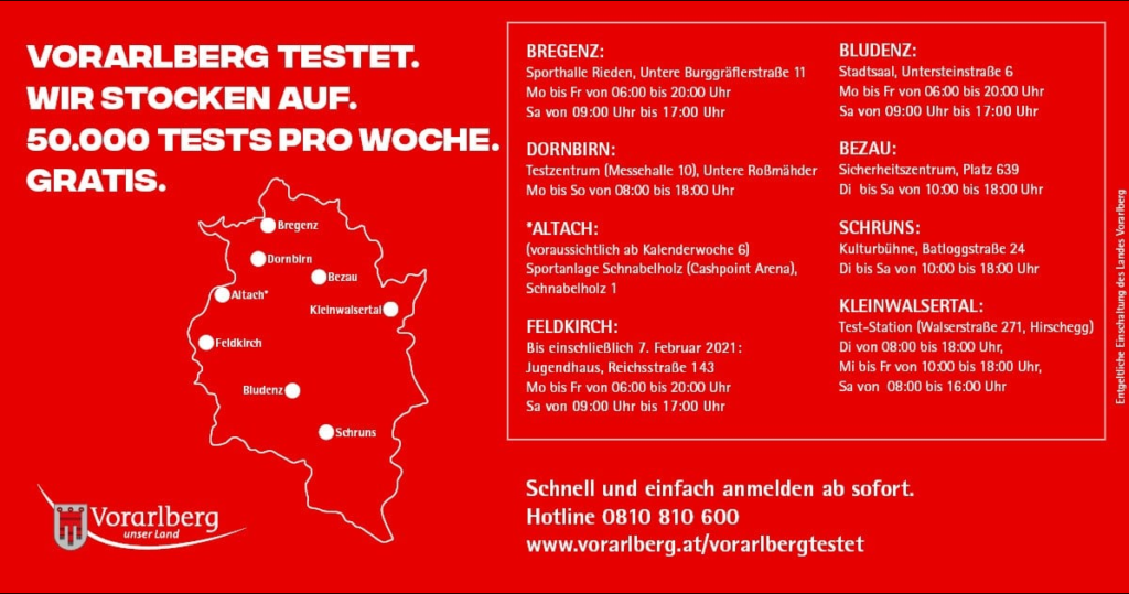 Folgende 23 Testorte sind derzeit (Stand So 07.02. Abends) verfügbar. Die Testzeiten können an den kleinen Standorten abweichen.